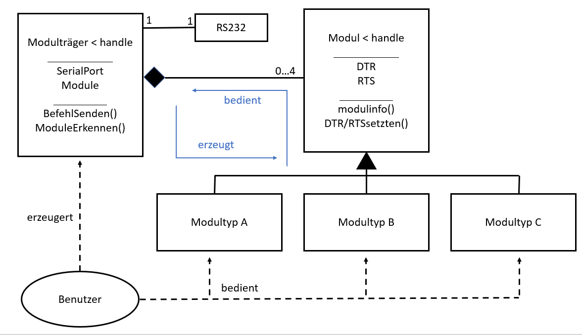 Die dargestellte Programmstruktur funktioniert in diese Richtung auch gut, doch die Funktionalität beim erzeugen der Objekte scheint mir eingeschränkt. Es wäre schön wenn der Modultäger anfangs die besetzten/ unbesetzten Plätze eigenständig erkennen und die verbauten Klassen erzeugen kann. Dazu gibt es eine Modulinfo-Funktion (Befehl), die (der) für alle Modultypen bekannt ist und den Modultypen abfragen kann.