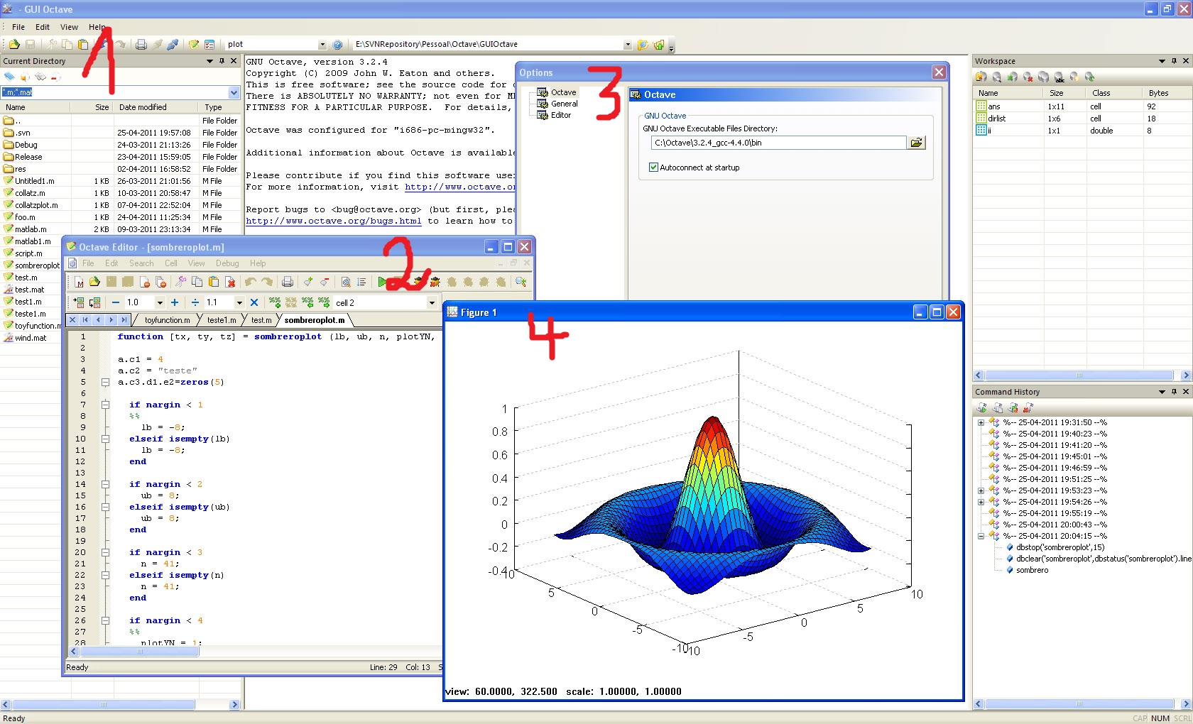 Dann ist da das Command Windows(Konsole) bietet Interaktion zwischen Benutzer und dem Octave Programm, um die eingegeben Befehle direkt ausführen oder Scripte(Folge der Befehlen) ausführen.