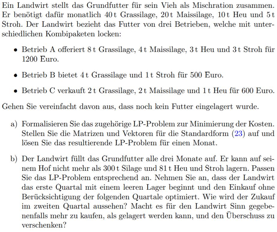 ein kleiner, aber feiner Fehler: die Ungleichungen sind in der Form A*x <= b. Wenn der Landwirt aber bestimmte Futtermittel benötigt, dann würde ich sagen, dass er die mindestens benötigt, d.h. du willst A*x >= b oder äquivalent -A*x <= -b. Anders gesagt: du musst bei A und b ein Minus davor setzen.