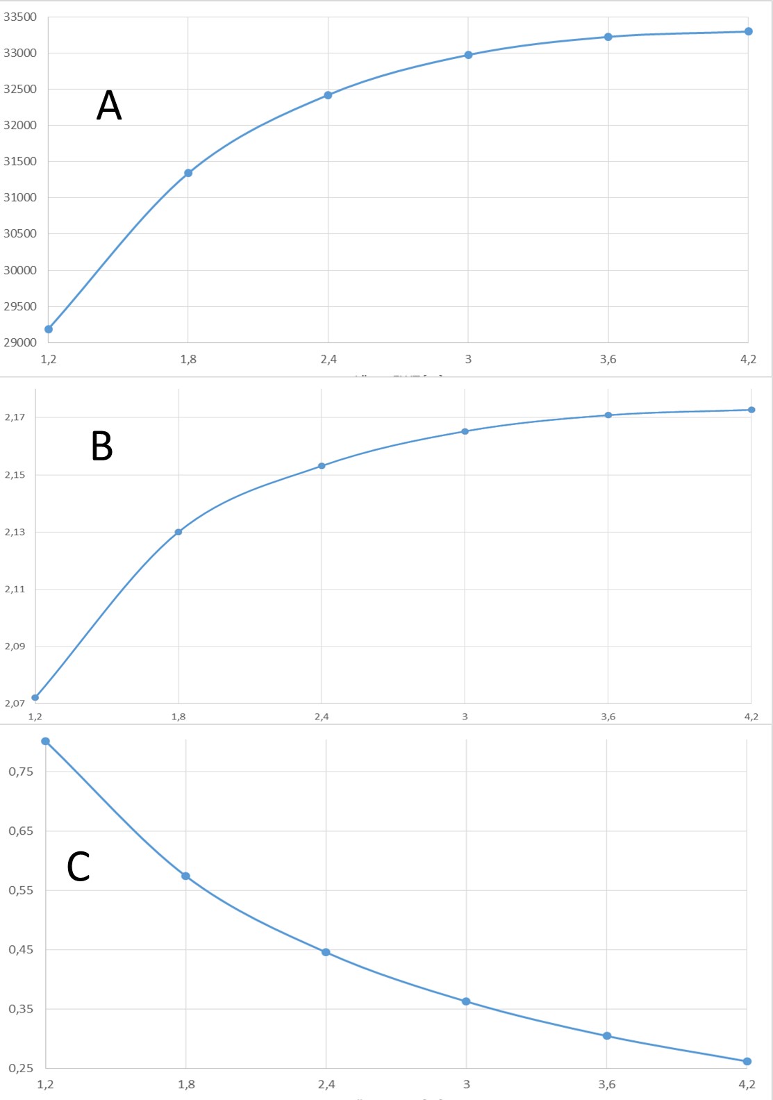 Wie man sehen kann Verläuft C umgekehrt zu A und B. Weiter ist es zu sehen, dass der Anstieg von A und B anfangs stärker ist und später immer weniger wird. Gleichzeitig ist der Abfall von C anfangs stäkrer als gegen Ende. Es muss also ein Optimaler Betriebspunkt geben bei dem es gilt alle Drei Graphen weisen möglichst ihren höchsten Wert auf.