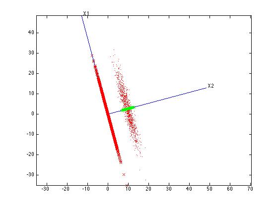 Im Bild sieht man die Punktwolke (rot), und die Hauptkomponenten die ich mit PCA berechnet habe.