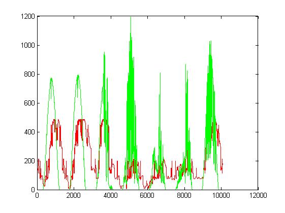 Im Moment versuche ich das Netz auf den Verlauf zu trainieren und versuche eben das Ausgang des Netzes (rot) auf den tatsächlichen Globalstrahlungswert (grün) abzugleichen. Der Plot nach dem Training ist im Bild dargestellt. Wie man auf dem Plot sieht, ist die Performance nicht die beste und ich frage mich nun wirklich, was ich tun kann, um die Performance zu verbessern. Denn der Fehler dort liegt noch bei gut 40% und so macht eine Vorhersage nicht viel Sinn. Ich hab schon verschiedentlich mit den Neuronenzahlen rumgespielt und auch die Trainingsfunktionen variiert, jedoch mit mäßigem Erfolg.