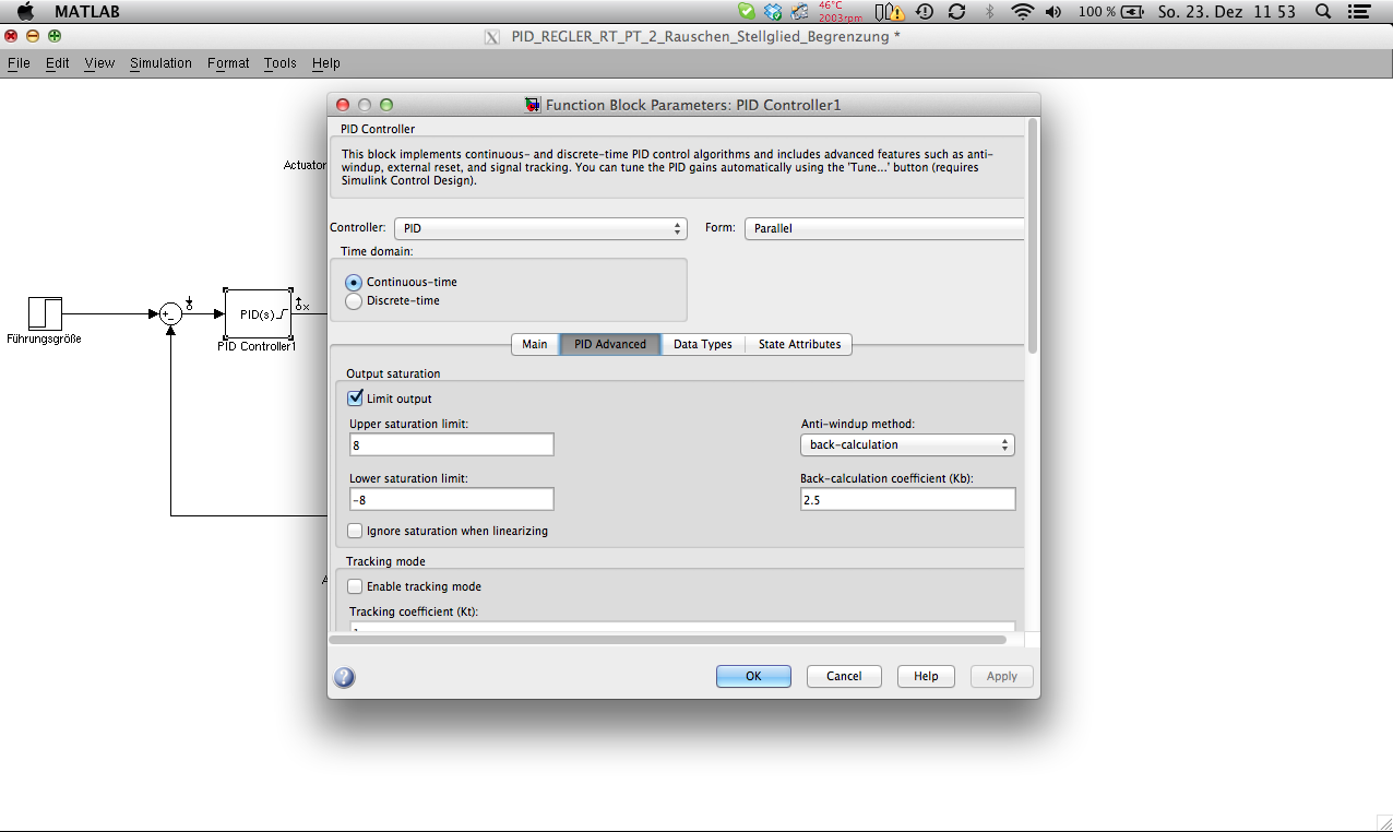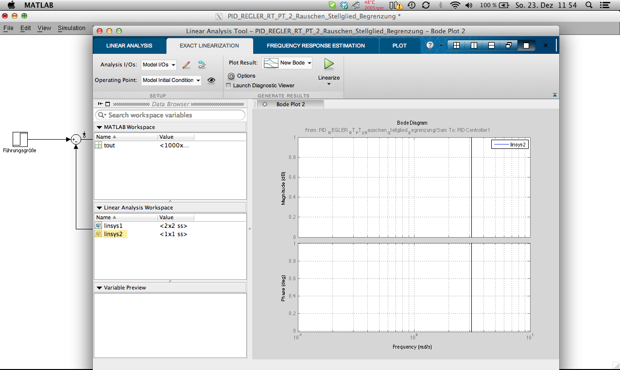 Ich habe ein Reglerkreis aufgebaut mit einem PID Regler und Anti-Windup Funktion. Wenn ich diese Funktion aktiviere, erstellt mir Simulink kein Bodediagramm mehr vom Regler. Deaktiviere ich die Funktion, macht er mir wieder eins. Was kann das Problem sein? Hier einige Screenshots. Bilder sagen ja schließlich mehr als 1000 Worte