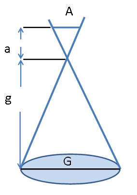Siehe Grafik im Anhang: Nach Strahlensatz gilt . Weiterhin ist und G entspricht der Distanz in Millimeter. const ist das Verhältnis Millimeter pro Pixel. Es ist eine Eigenschaft der Kameralinse. Zur Kalibrierung wird ein Sollwert für G eingesetzt.