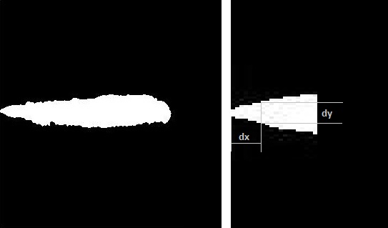 Nun würde ich gern, ausgehend von der linken Bildseite, für jeden Pixelabstand dx, den Abstand der äußersten weißen Pixel dy (siehe angehängtes Bild) ausgegeben bzw in ein *.txt Dokumente geschrieben bekommen.