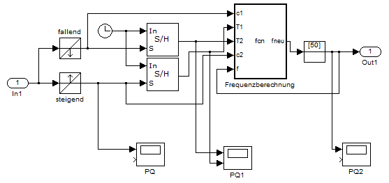 Ich versuche momentan eine ganz einfach PLL zu simulieren, die mir aus einem sinusförmigen Signal die Frequenz bestimmen kann. Dafür möchte ich durch das Erfassen der Nulldurchgänge die halbe Periodendauer bestimmen und die Frequenz dann über f=1/(2*halbePeriode) berechnen. Aber irgendwie bekomme ich das nicht wirklich hin. Bei meiner bisherigen Lösung (siehe Anhang) kann die Frequenz nur unzureichend genau bestimmt werden. Ich denke das liegt vor allem daran, dass die Ausgänge der "Hit crossing" Blöcke recht lange auf dem Wert 1 bleiben und die "Sample and Hold" Blöcke somit nicht ganz genau die korrekte Zeit erfassen können. Die "Embedded Matlab Function" ist Folgende: