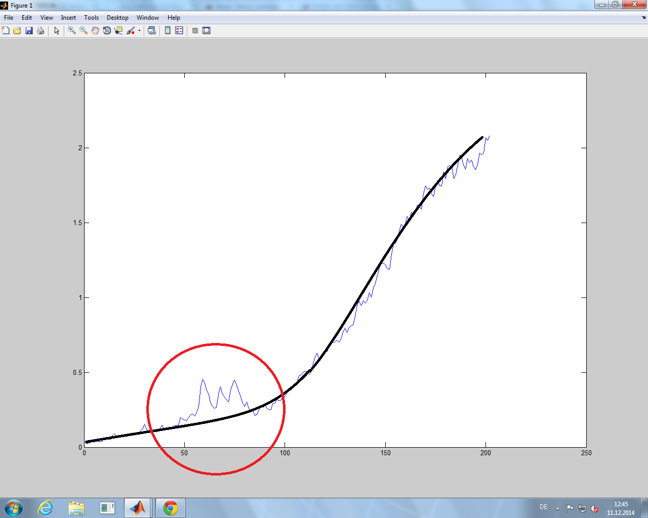 Der geglättete Graph soll in etwa wie die provisorisch eingezeichnete schwarze Linie aussehen. Wichtig hierbei ist der rot markierte Bereich, den ich so nicht hin bekomme.