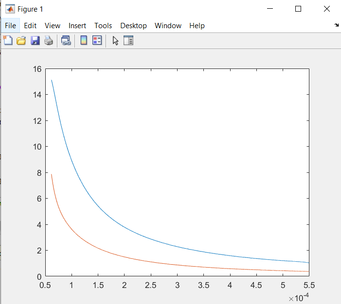 Nun habe ich es mit dem normalen Plot geschafft die beiden Kurven in einen Graphen zu bekommen. Jetzt stehe ich vor der Aufgabe, den Flächeninhalt zwischen den zwei Kurven mit Hilfe einer for-Schleife zu bestimmen.