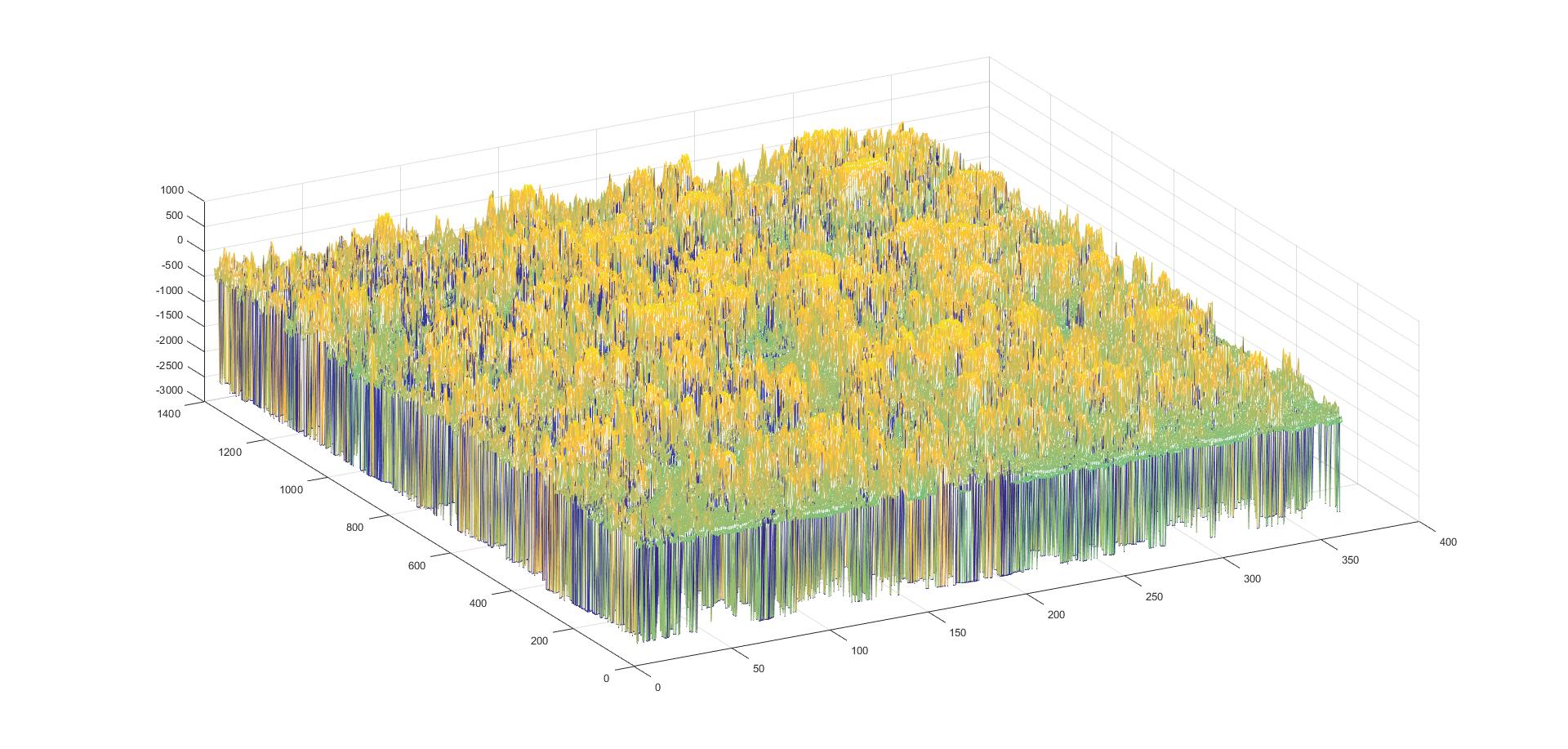 Das heist, ich hab im Prinzip ne 1374*361 Matrix. Diese kann ich auch als Mesh-Plot oder Surf-Plot darstellen. Das Ergebnis ist aber sehr unbefriedigend, da das mesh-grid aufgrund der vielen Messpunkte mehr oder weniger nur ein großer klotz ist. Weshalb ich mit dem scatter3 oder dem plot3 Befehl versuchen möchte eine Point Cloud zu erstellen.