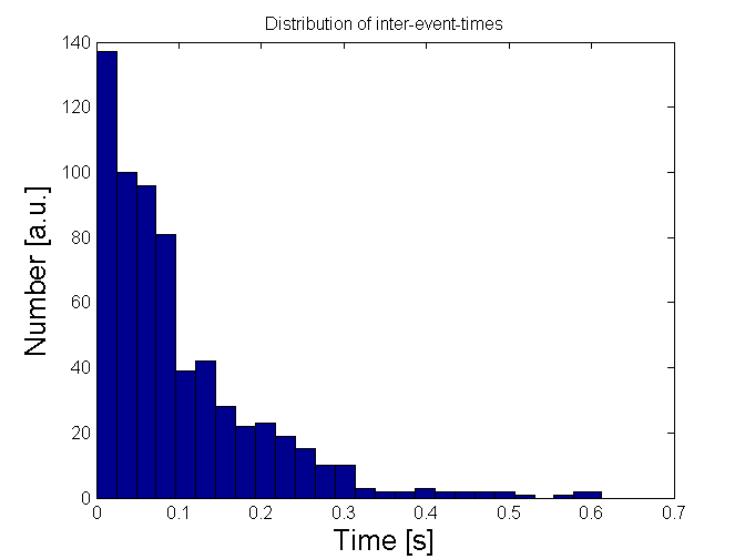 ich versuche einen Poisson Prozess zu simulieren, d.h. Ereignisse über einen definierten Zeitbereich poisson zu verteilen. Bisher klappt das mit dem folgenden code auch akzeptabel. Wenn ich die Wartezeiten (IVI_hist) zwischen events histogrammiere sind sie wie erwartet exponentiell verteilt (s. Anhang). Allerdings würde ich gern beweisen dass der simulierte Prozess tatsächlich auch poisson-verteilt ist. Daher habe ich mir überlegt den Fano-Faktor zu bestimmen. Wie mache ich das mit meinen Daten?