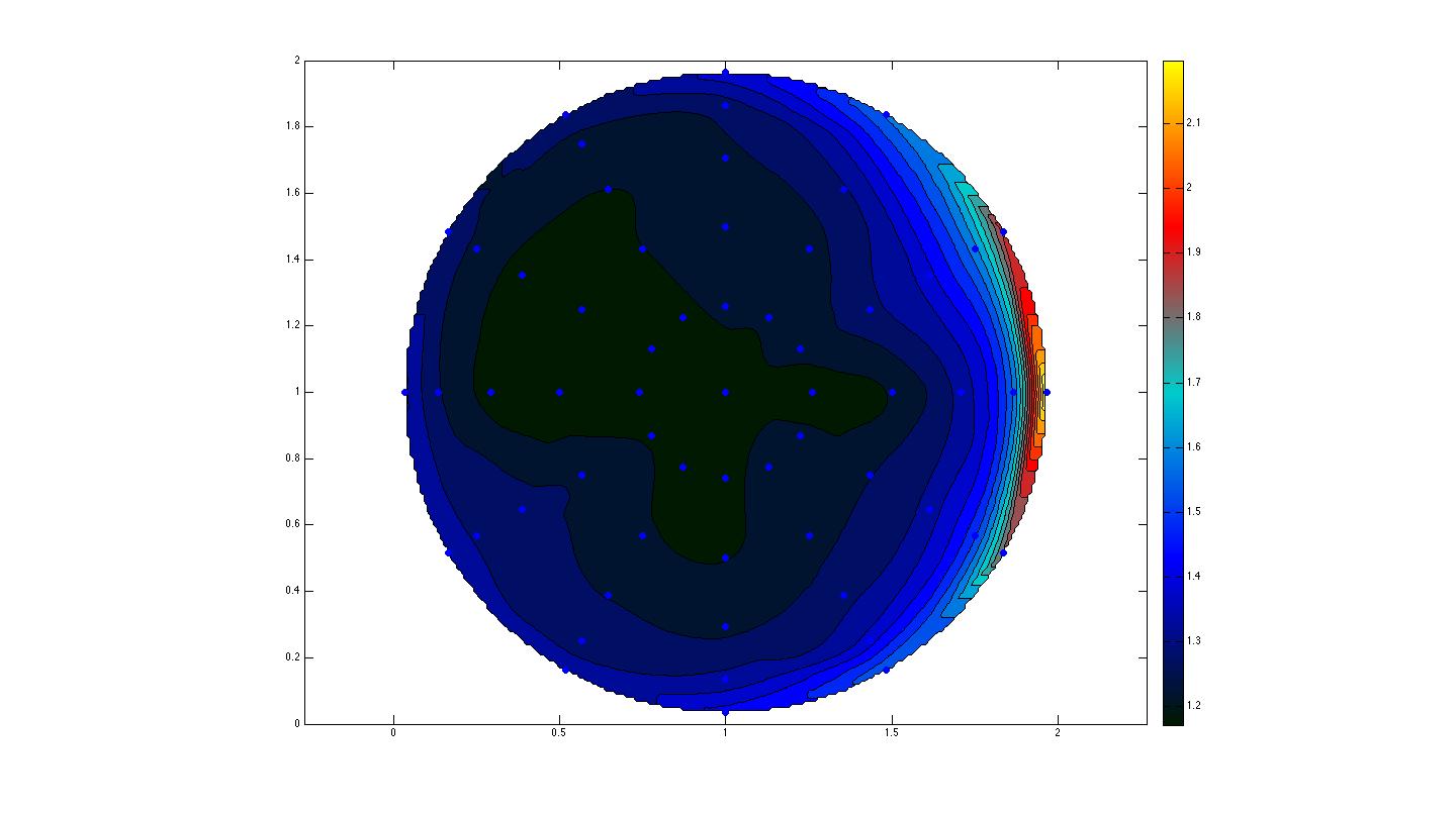 Ich hab da mal eine Frage: Ich habe Daten, die aus 66 Messpunkten bestehen, gleichmässig verteilt über eine Hemisphäre/Halbkugel. Ich Projeziere die ins 2D, habe also Punkte in einem Kreis (Ich habe ein Bild davon angehängt, die Originalmesspunkte sind blau eingezeichnet). Nun möchte ich gerne interpolieren. Mit meshgrid/griddata gehts problemlos, nur hab ich dann den radialen Charakter nicht berücksichtigt. Auch habe ich Funktion die zum Download stehen wie polar3d.m ausprobiert. Das klappt alles prima, beim übergang von 360° zu 0° zeigt sich aber halt immer dass das Ganze halt die Sache mit der Periodizität nicht berücksichtigt (ich habe auch ein Bild angehängt, plot2.jpg). Das heisst wenn ich auf dem Kreis bei beliebigem Radius periodisch drehe, müsste ich auf einer glatten Kurve gleiten.