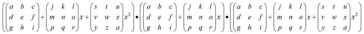 Wie kann man ein Polynom multiplizieren, dass wie in der Darstellung aufgebaut ist? (Die Koeffizienten des Polynoms sind Matrizen Aufbau in Matlab B(Zeile,Spalte,Potenz+1) zB x^0 B(:,:,1) )