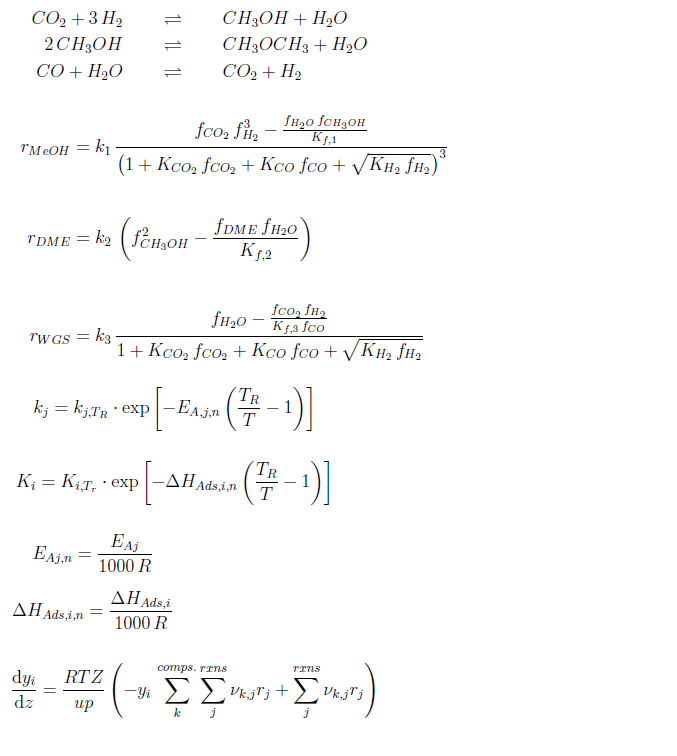 Im Anhang sind die Gleichungen zu meinem Reaktionsmodell für eine chemische Kinetik. r ist die Reaktionsrate (Umsatz eines Stoffes in Menge Stoff / (m^3*s)). Diese taucht auf in der Differentialgleichung dy_i (delta Stoffemengenanteil an allen Stoffen)/ dz (z= Achse eines Reaktors, an dem Stoffe entlangfließen und reagieren). f, p, u, R,T, Z sind extern gegeben oder vom aktuellen y-Wert abhängig. K_substanz, EA_Reaktion, dH_Reaktion und k_Reaktion sind die zu schätzenden Parameter.