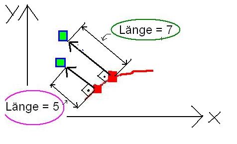 Ich würde gerne folgendes machen. Zeichnerisch müsste das so gehen: Ich möchte den Gradienten für jeden Punkt der Funktion 1 haben. Die Länge der Gradienten sollen = dem y-Wert der 2. Funktion sein. Jetzt habe ich für jeden Punkt auf der Funktion 1 je einen Vektor mit der jeweiligen Länge und Richtung. Und um diese Vektoren möchte ich jeden Punkt auf der Funktion 1 verschieben. (Bild 3).