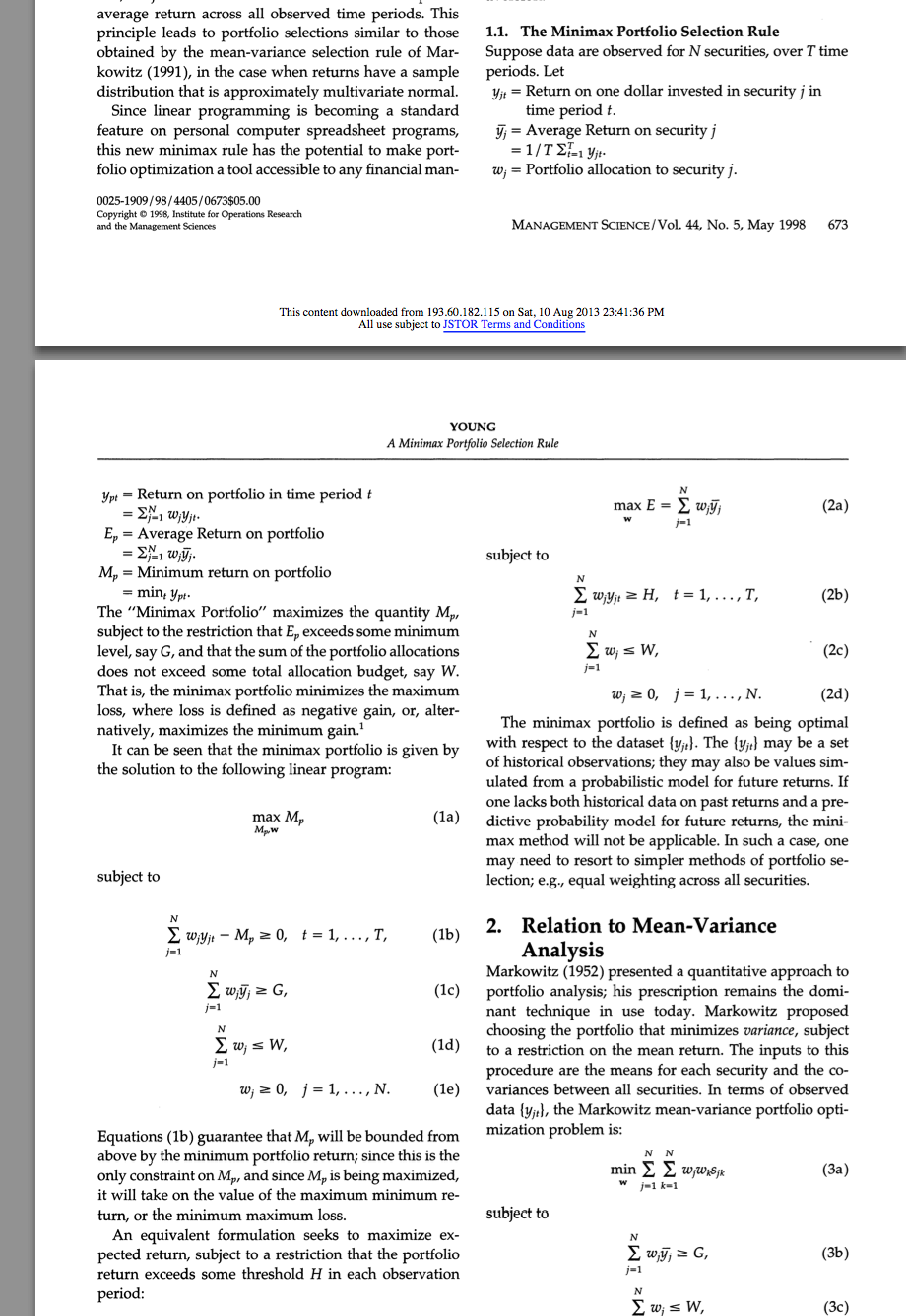 Das "Minimax-Portfolio" maximiert den Wert M_p (also den minimalen Return eines portfolios p) - unter der Bedingung dass E_p ein gesetztes minimum von beispielsweise G übersteigt. Darüber hinaus darf die Summe PortfolioAnteil nicht größer als 1 (100% sein) und es gilt 0<= w_j <= 1 .
