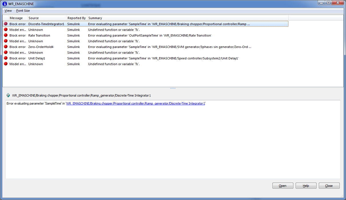 Wenn ich der Powergui ein SampleTime vorgebe meldet mir Simulink bei der Ausführung mehrere Fehler (Ts usw. nicht definiert) (Bild: Fehler).
