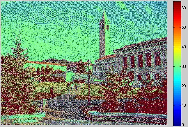 Nun will ich das Bild aber in ein indexed image umwandeln (unter verwendung der colourmap jet). Tue ich das wie im code unten, wird die colorbar an der seite des Bildes so angezeigt wie sie aussehen muss, das Bild jedoch ist plötzlich irgendwie körnig, und die Farben stimmen nicht.
