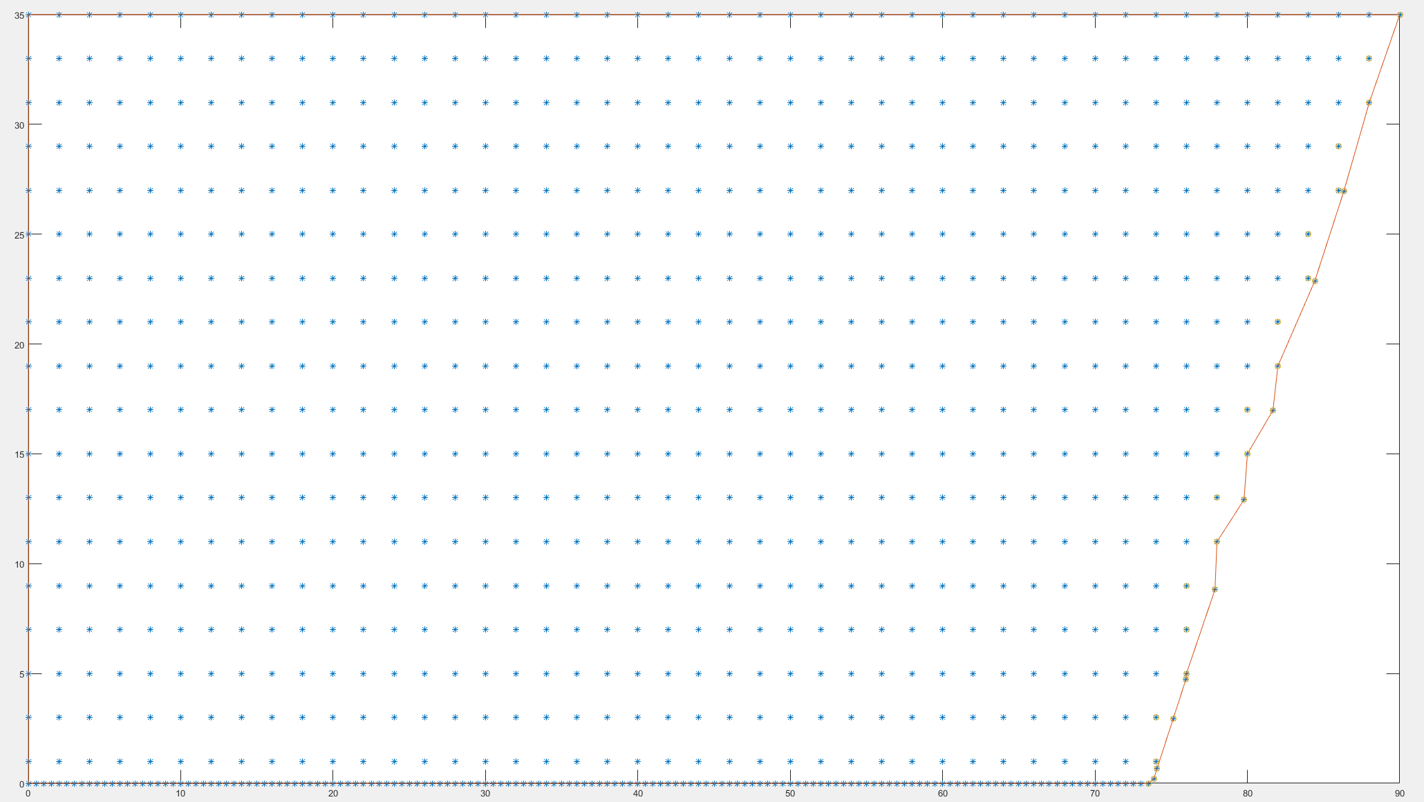 Im Bild zu sehen ist einmal die boundary und die maximalen x Werte pro y-Reihe...