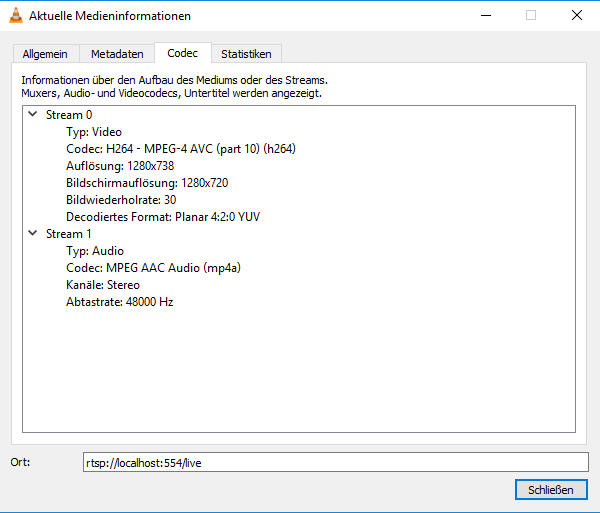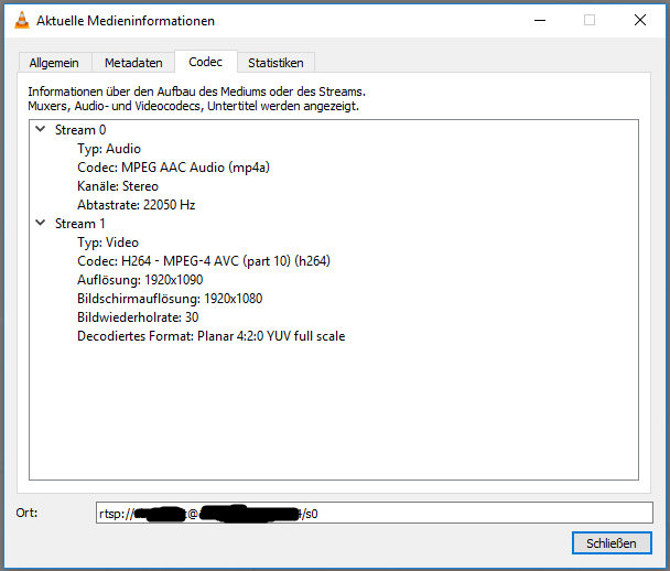 Die URL habe ich aus der Oberfläche (Stand Alone Modus) der Kamera bzw. aus dem OBS-Studio in VLC eingegeben und im VLC wird mir das Video angezeigt. Ich habe auch die Codec-Informationen aus dem VLC geprüft. Im Vergleich zur Hilfe habe ich 2 Streams, aber der Video-Stream ist H264 (siehe Bilder).