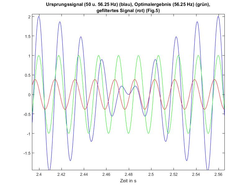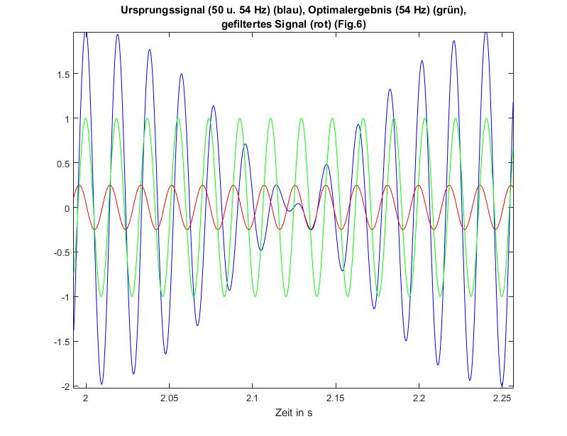 Ich habe das ganze mal ausführlicher mit Summen aus je zwei Kosinus getestet. einer davon hat eine Frequenz von 50 Hz und wird herausgefiltert, der Zweite hat eine Frequenz von 50 bis 75 Hz. Das Ergebnis der Filterung wird anschließend mit dem was eigentlich herauskommen sollte, nämlich der Kosinus der keine 50 Hz Frequenz hat, verglichen. In Fig. 3 bis 6 sind die Resultate dieses Vergleichs dargestellt. Wärend der 75 Hz Kosinus noch exakt das Optimalergebnis trifft, verschiebt sich für Frequenzen näher an 50 Hz das gefilterte Signal immer weiter nach links vom Optimalergebnis weg.