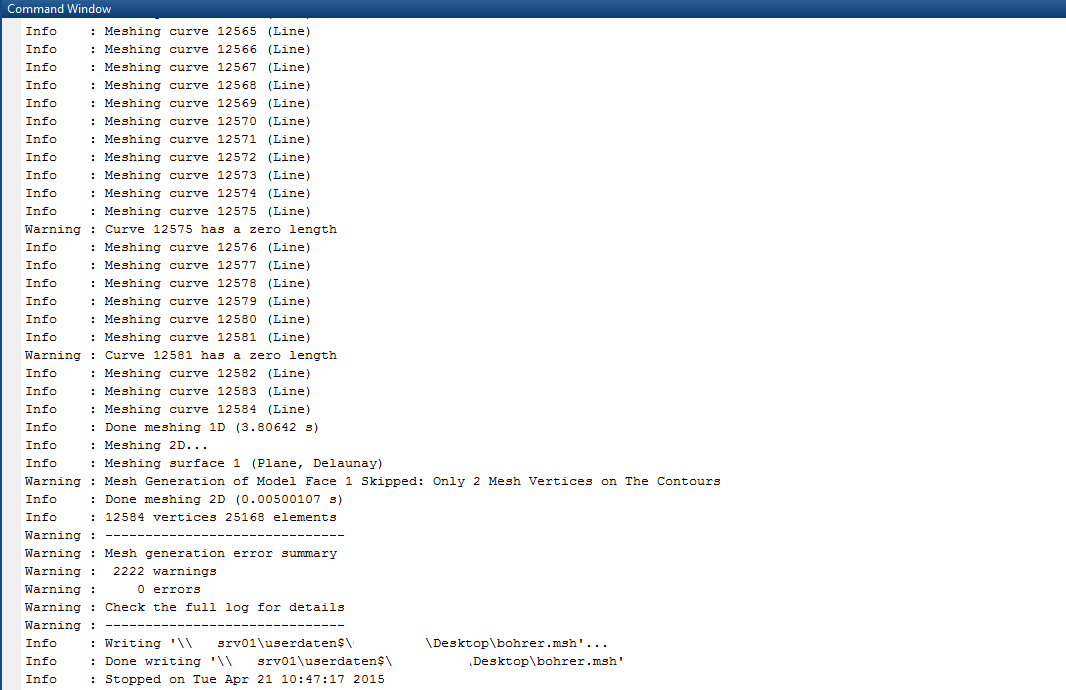 ich verwende das Programm Gmsh, um mithilfe von Matlab eine Bohrerkontur zu vernetzen. Matlab plottet die Kontur und gibt alle nötigen Informationen raus. Die Kontur wird in Gmsh auch korrekt an gezeigt (vgl. Anhang)