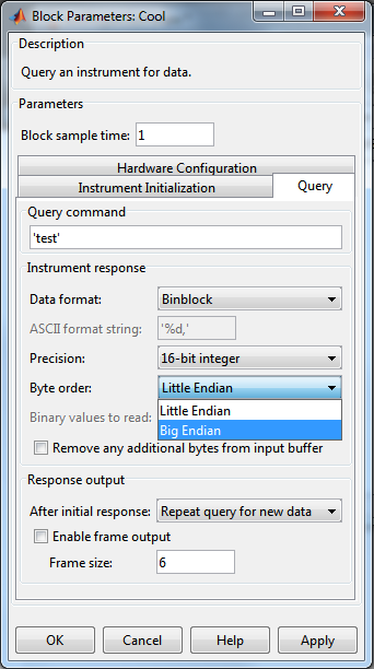 Zunächst habe ich versucht die Blöcke direkt über die Dialogbox zu konfigurieren. (siehe Screenshot "QueryInstrument_Properties.png"). Ich benötige die Option "Byte order" : "Big Endian". (Little Endian ist default).