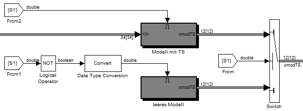 ich habe ein Modell aufgezogen, bei dem verschiedene Sub-Modelle über Enabled-Subsystems aktiviert werden. Die Aktivierung erfolgt vor Simulationsstart per init-file, also S1 ist die ganze Zeit auf "1" oder "0". Sollte das Modell deaktiviert sein, übernimmt das andere Modell und beschreibt den BUS mit leeren Signalen.