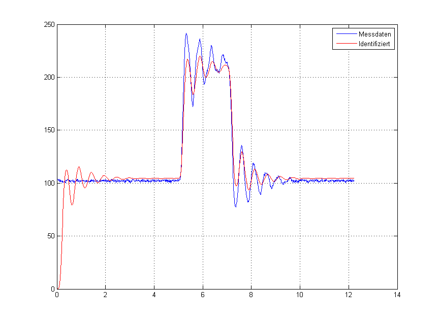 Jetzt probiere ich verschiedene Parameter durch und überprüfe die "Güte" der identifizierten Übertragungsfunktion in dem ich damit eine Simulink-Simulation mit den selben Inputs wie am Labormodell mache und dann die Messdaten mit den Simulierten Daten vergleiche