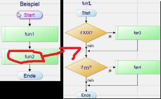 Gibt es dafür eine möglichst normgerechte Darstellungsweise um das in einem Schaubild zu zeigen? Indem ich z.B. in das Symbol für fun2 die weiteren Symbole zeiche oder an den fun1 Block direkt die "if XXX?" Abfrage und alles was folgt anhänge?