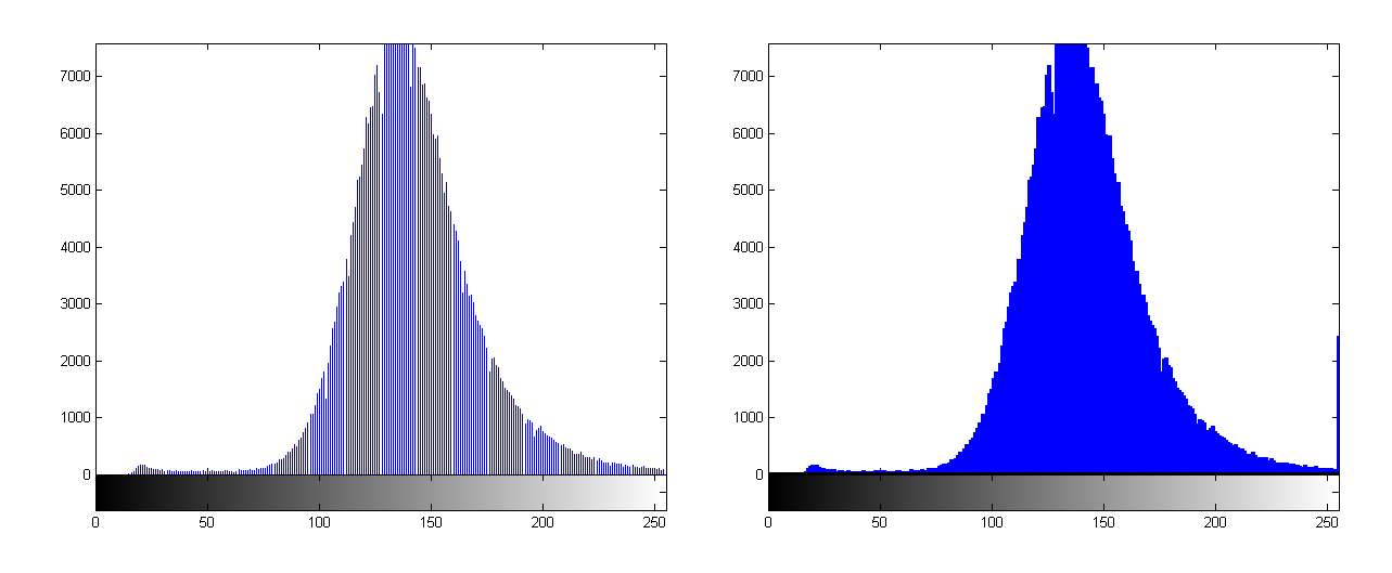 Ich möchte in einem Histogramm den Balken über dem Grauwert Null hervorheben, da der genau auf meine Y-Achse liegt. Leider spuckt die Funktion imhist aber kein Handle aus, über das ich an die Eigenschaften gelangen könnte. Ich weiß, dass der Plot in der imhist-Funktion einfach über die stem-Funktion erstellt wird. Ich möchte nicht manuell in der imhist.m rumpfuschen, da ich auch an mehreren Rechnern arbeite.