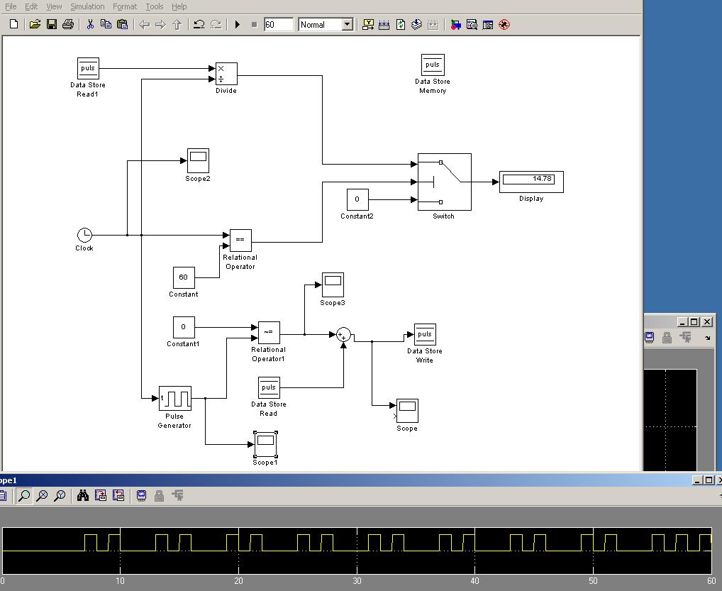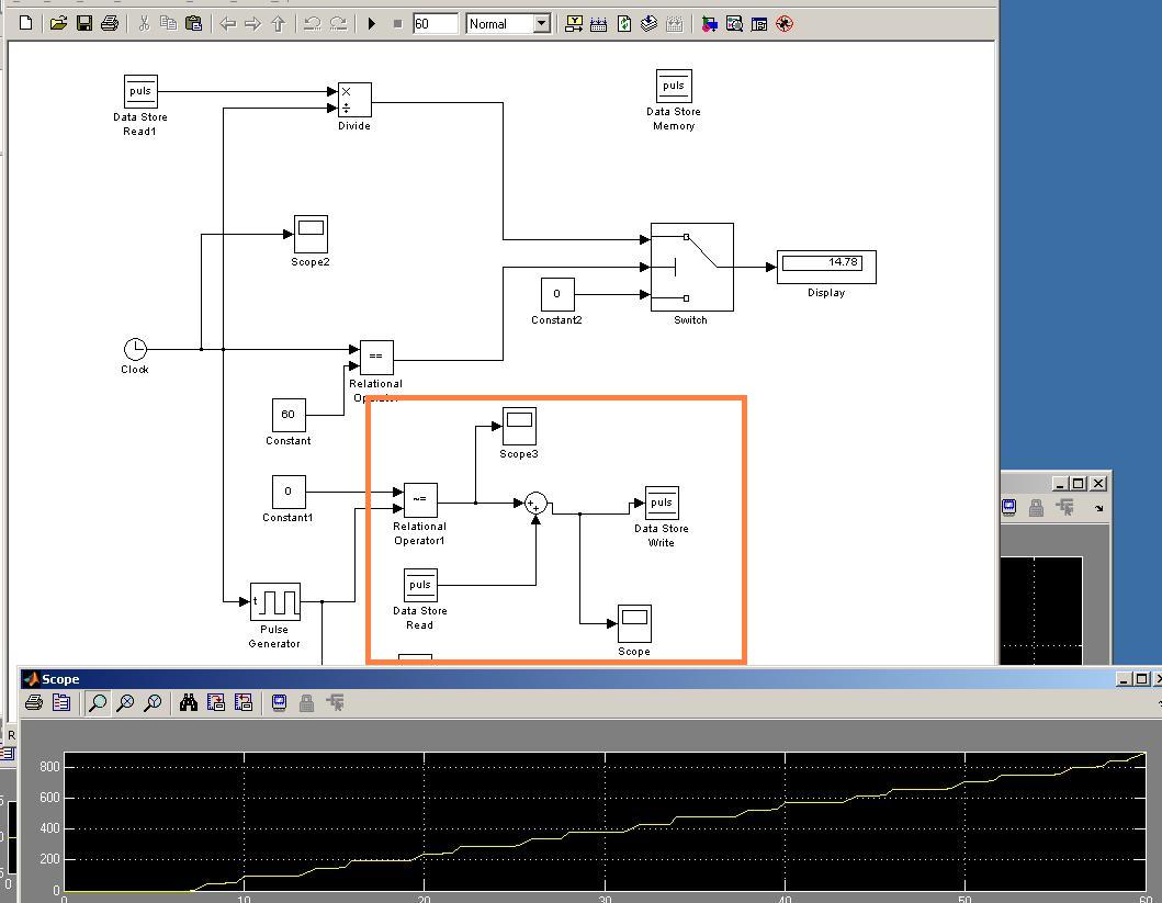 achso...und noch etwas: "puls" (Data Store Memory) soll ja an der markierten stelle immer um 1 erhoeht werden. wenn ich da aber ein scope anschliesse, zeigt der mir an, dass nicht immer 1 addiert wird mit jedem impuls, sondern nur am anfang und danach groessere zahlen... kann mir da jemand vielleicht helfen?