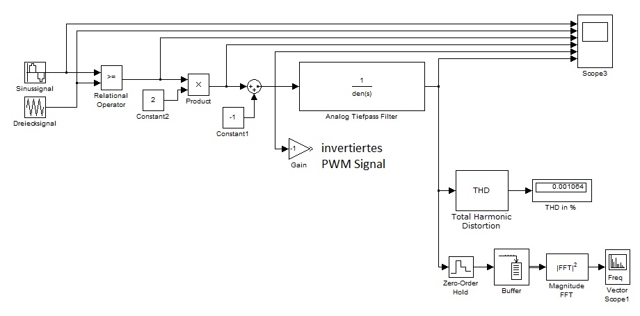 Der Product Baustein und der addierer sind nur dafür, das PWM Signal so zu verschwieben das die Amplitude des PWM Signals von plus in Minus geht und nicht von Plus zu 0.