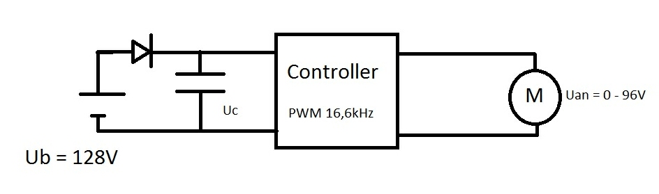 Die Spannung wird über den Controller (Kelly Controller KDH14601E) geregelt. Da ich keine Ahnung habe, was im Controller passiert und es mir auch niemand (nichtmal der Hersteller selber) sagen kann, muss ich mir ein vereinfachtes Modell bauen.