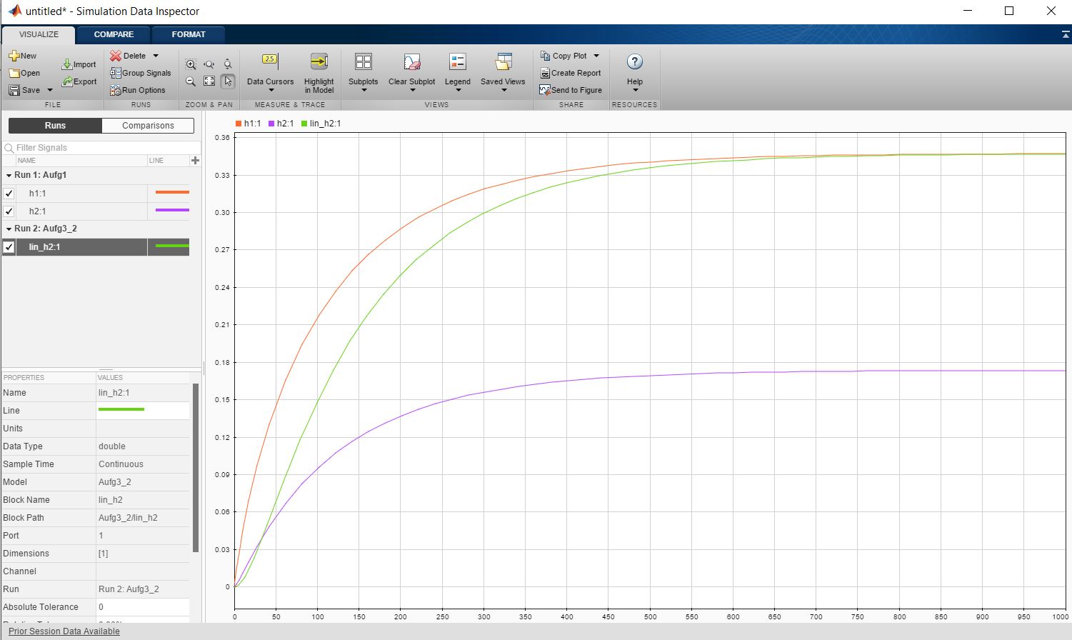 Wenn ich das linearsierte System simuliere, nährt sich mein Füllstand "lin_h2" jedoch nicht dem Arbeitspunkt von "h2" an, sondern dem Arbeitspunkt von "h1".