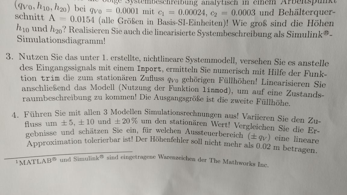 Im Zuge eines Belegs soll ich den Arbeitspunkts eines Systems mit der Funktion "trim" finden und das System anschließen linearisieren mit "linmod".