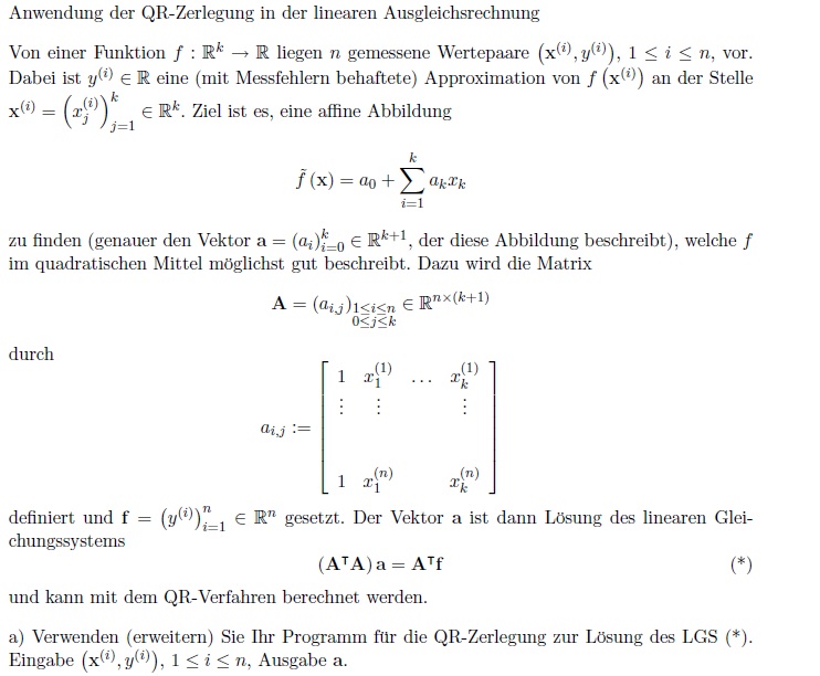 disp('Es wird eine QR-Zerlegung mit Householder berechnet.') disp('====================================================') disp('---------------------------') disp('| H=I-ß*uu^T |') disp('| u=x+sign(x1)*||x||_2*e1 |') disp('| ß=2/(u^Tu) |') disp('---------------------------') disp(' ')