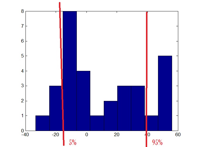 Ich möchte die sortierte Verteilung plotten. Wie in der Grafik zu sehen würde ich gerne noch von links die 5% und von rechts die 5 Prozent in die Variable schreiben und grafisch gezeichnet haben erstellen.