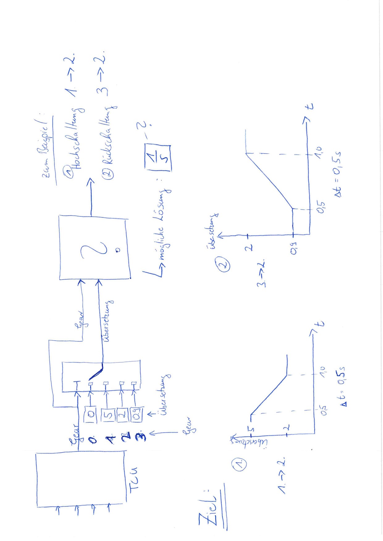 Wie unter der Überschrift ZIEL dargestellt, möchte ich über delta t = 0,5s entweder Hoch- oder Rückschalten. Dabei ist z.b. bei der Hochschaltung von Gang 1 zu 2 das Übersetzungsverhältnis von 5 zu 2 zu überwinden.