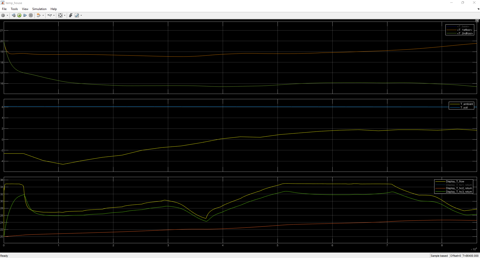 Wie man an den Graphen sehen kann, scheint das Obergeschoss immer mehr an Temperatur (T_2ndfloor) zu verliefen. Gut ersichtlich ist es auch an der Beobachtung des Vor- und Rücklaufs (T_flow // T_hc3_return). Die beiden Funktionen laufen annähernd parallel mit geringem Temperaturunterschied, während die Rücklauftemperatur von Heizkreis 2 (T_hc2_return) deutlich darunter verläuft.