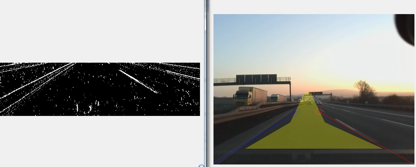 ich arbeite gerade an einer Hough-Transformation für eine Spurerkennung. Gibt es eine Möglichkeit aus einem Binär-Video (siehe Anhang Bild links) das Rauschen zu entfernen? Dies tritt nur kurzfristig auf, allerdings immer mal wieder während des Videos. Im Original nicht sichtbar.