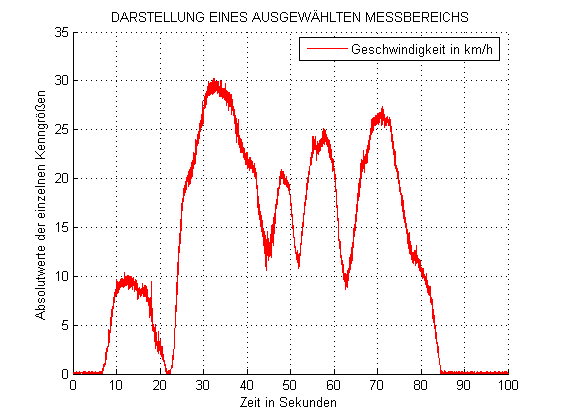ich habe ein kleines, ferngesteuertes Fahrzeug mit Messinstrumenten ausgerüstet. Auf diese Weise konnte ich die gefahrene Geschwindigkeit aufzeichnen (s. Grafik). Wie man sieht enthalten die Messdaten ein Rauschen (breite Linien) und sind daher nur schwer auszuwerten, da eine genaue Geschwindigkeitsbestimmung zu bestimmten Zeitpunkt nicht möglich ist.