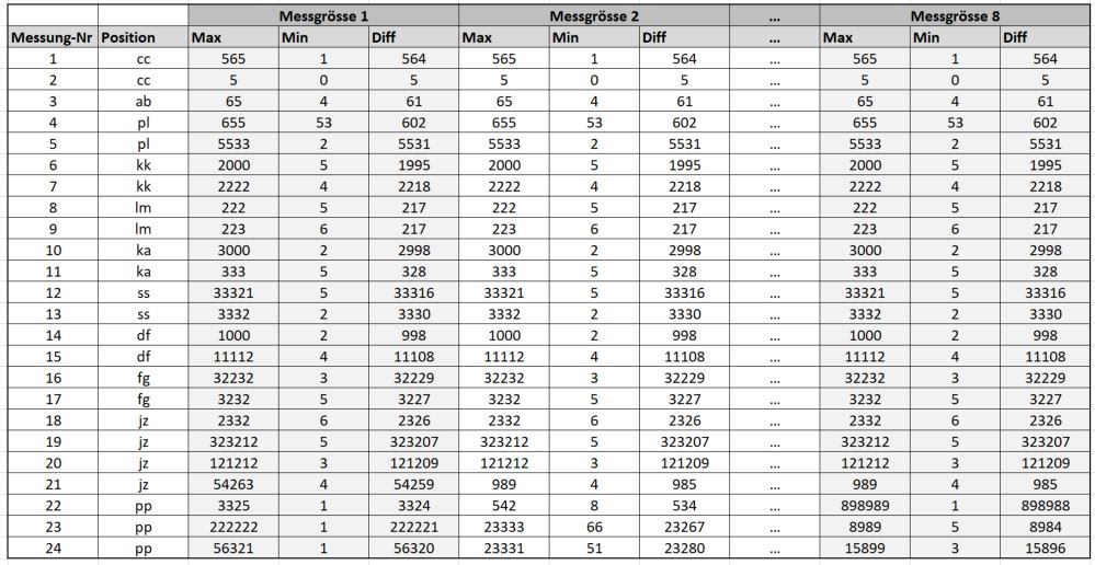 Ich habe eine Exceltabelle (siehe Bild) mit 8 Messgrössen. Pro Messgrösse habe ich drei Spalten, mit dem Minimum-Wert, dem Maximum-Wert und der Differenz.