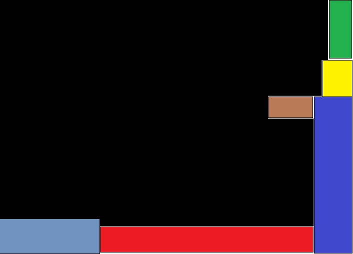Ich besitze eine (binäre) Matrix, die wie im Bild darstellbar ist. Ich möchte nun aus diesem Array Rechtecke erzeugen, die den Farben in dem Bild ähneln (Es muss nicht genau diese Anordnung sein). Ich weiß, dass das Bild jetzt kein Binärbild ist, aber ihr müsstet euch nur vorstellen, dass dort, wo die Farben im Moment sind, weiße Bereiche sind. Die Farben dienen nur dazu, um zu zeigen, was ich meine.
