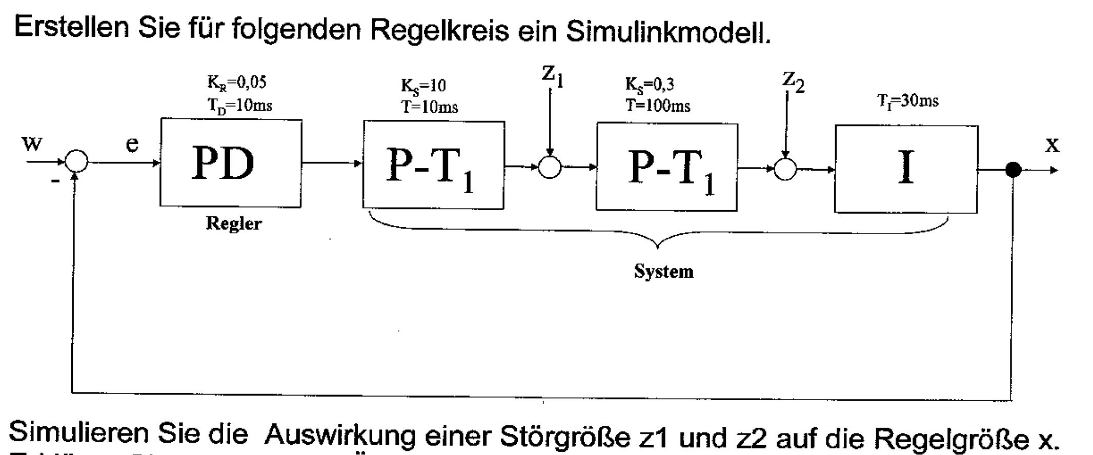 Der grundlegende Umgang mit Simulink ist mir bewusst und das Schaltbild habe ich größten Teils fertig. Nun wollte ich die Störgrößen z1 und z2 per Hand berechnen, was mir aber von meinem Betreuer untersagt wurde. Ich sollte doch alles per Matlab/Simulink lösen. Seine Ansicht, verstehe ich natürlich auch. Trotzdem nimmt er sich keine Zeit mit mir diese Aufgabe zu lösen. Deshalb bitte ich um ein wenig Hilfe.