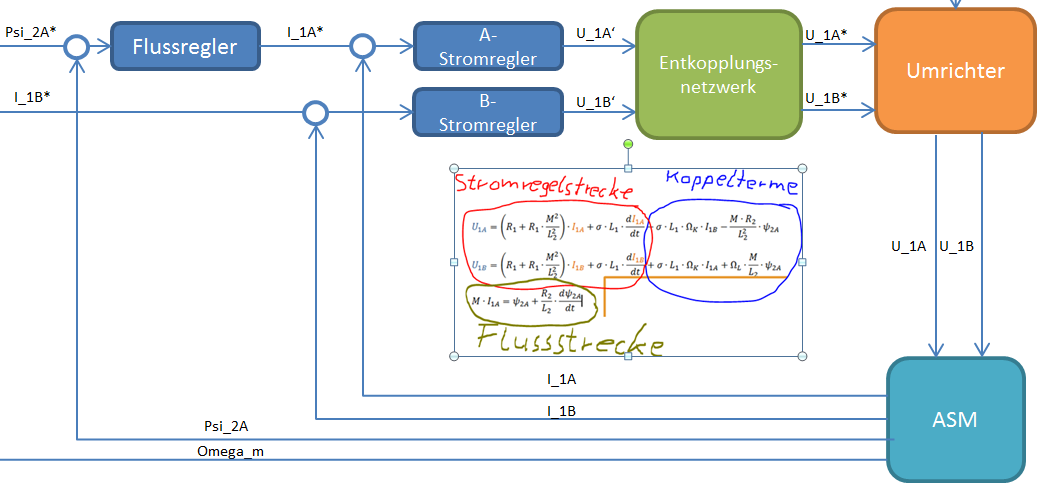 Nach dem anhängenden Schema soll der PI-Regler (Flussregler) einen unterlagerten Stromregelkreis reglen. Der Stromreglekreis ist 2 schleifig und dessen Regler sind BO ausgelegte I-Regler mit nachgeschlatetem Entkopplungsnetzwerk (da die Stromregelstrecke Koppeltherme enthält).