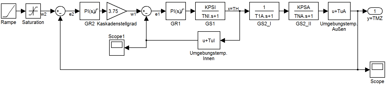 Mein Post beziet sich wieder auf das oben beschriebene thermische System, das mit einer Kaskadenregelung arbeitet. Daher eröffne ich kein neues Thema. Zum besseren Verständnis hänge ich das Blockschaltbild des Simulink-Modells als Bilddatei an.