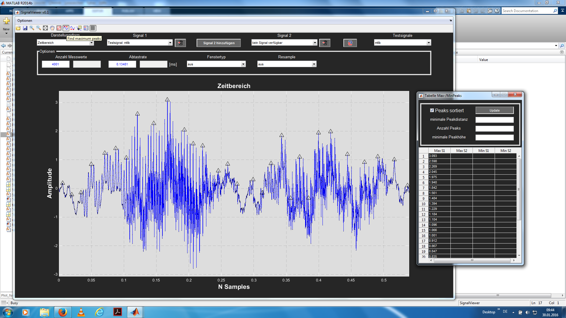 Man drückt nun z.B. den Button Maximum Peaks und ruft damit die subgui auf. Die Peaks werden im Plotfenster dargestellt und die subgui zeigt in einer Tabelle die Peakwerte an (siehe Bild). Nun drückt der User den Button für die Minimum Peaks. D.h. die subgui wird erneut aufgerufen, während sie von dem ersten Call noch geöffnet ist. Somit werden nun auch die Min. Peaks sowohl im Plot als auch in der Tabelle der subgui angezeigt. Mein Problem liegt nun in der Durchführung der beiden Calls bzw. eigentlich mit der Weiterführung des 1. Calls nachdem der 2. Call beendet wurde.