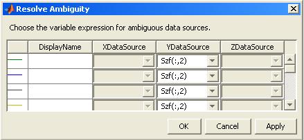 Wenn der Code nun ausgeführt wird, erscheint eine GUI- mit der Überschrift "Resolve Ambiguity" und da soll man für jede "YDataSource" eine Spalte "Szf(:,1) Szf(:,2) ... Szf(:,16)" eingeben.