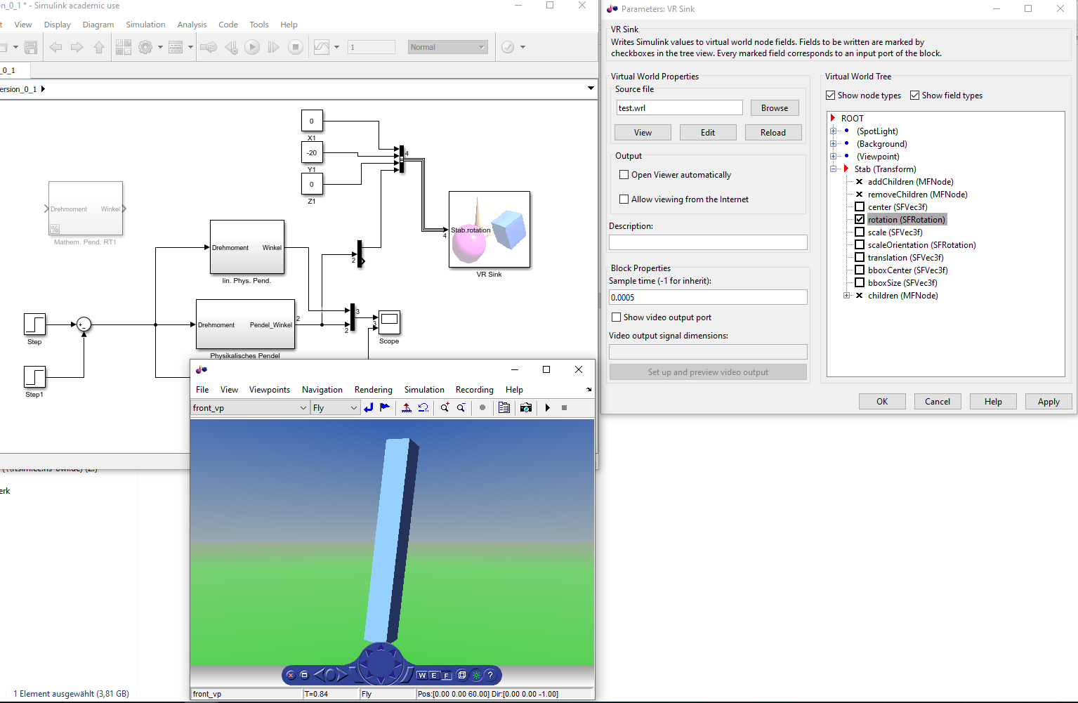 Ein Modell in Simulink existiert, die Ausgangsgröße "Pendelwinkel" möchte ich auf den Stab aus der VRML Zeichnung übertragen. Siehe Screenshot.