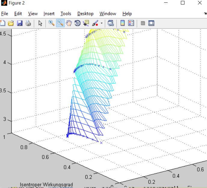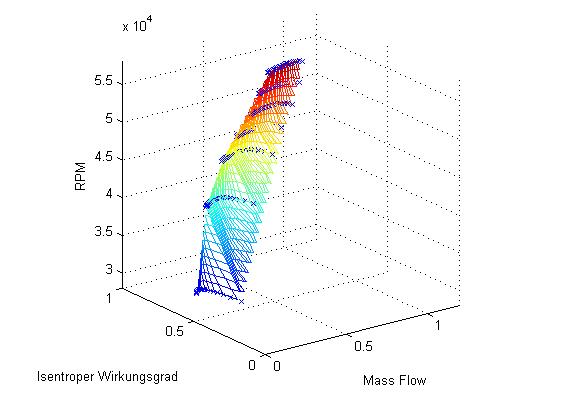 xlabel('Mass Flow') ylabel('Isentroper Wirkungsgrad') zlabel('RPM') hold off